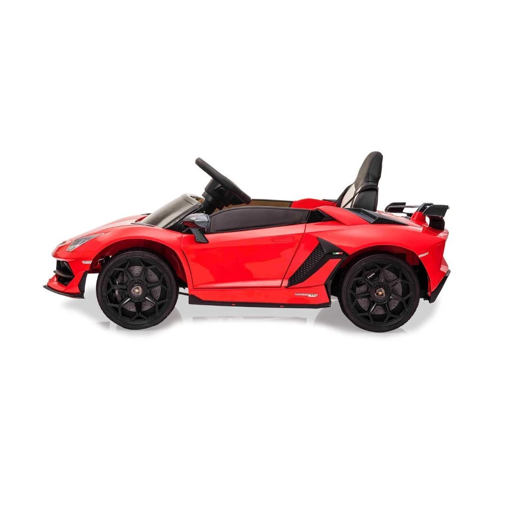 The red Lamborghini Aventador ride-on car offers an exciting driving experience for kids, featuring a realistic semi-leather seat, lights, and sound effects. Equipped with a parental remote control, it allows safe and fun play both indoors and outdoors. Its forward and reverse movement, combined with twin motors, makes it perfect for young car enthusiasts aged 3 to 7.
