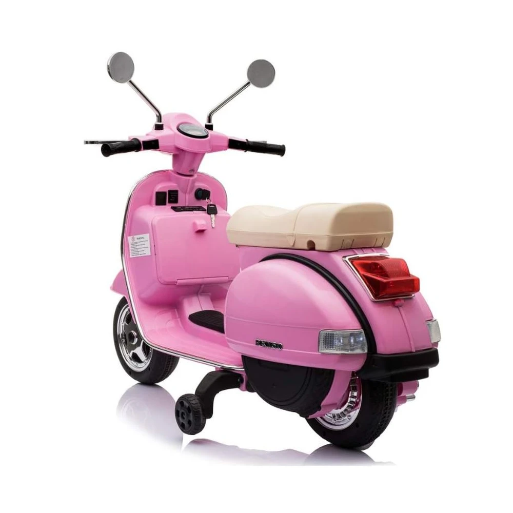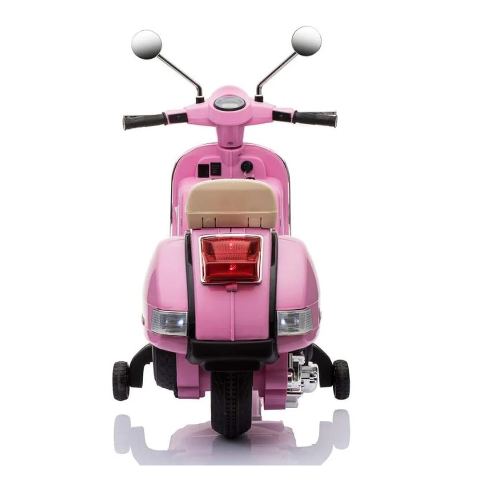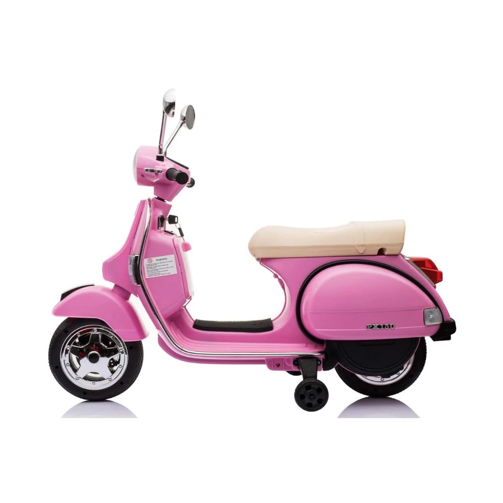 Vespa electric scooter with a 12V battery, support wheels for stability, leather seat, realistic lights and sounds, and MP3/AUX audio. Includes trunk and windshield for an authentic riding experience. Suitable for children 2+ years.