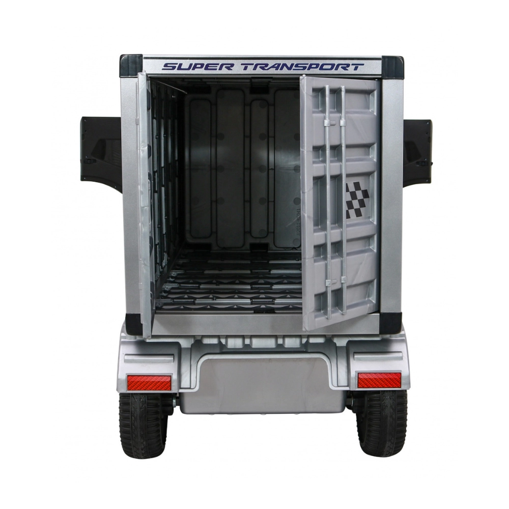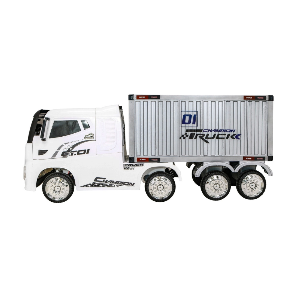 Powerful 12V container truck with detachable semitrailer, 4x25W motors, and parental remote control. Features LED lights, MP3 player, USB, leather seat, and EVA wheels for a safe and realistic driving experience.