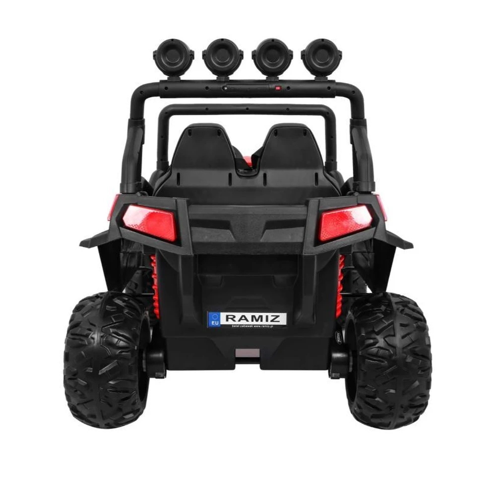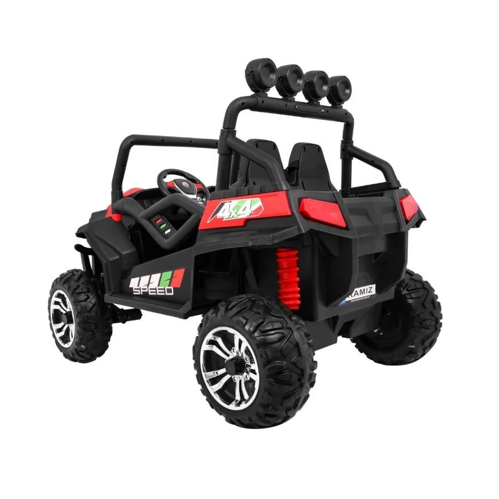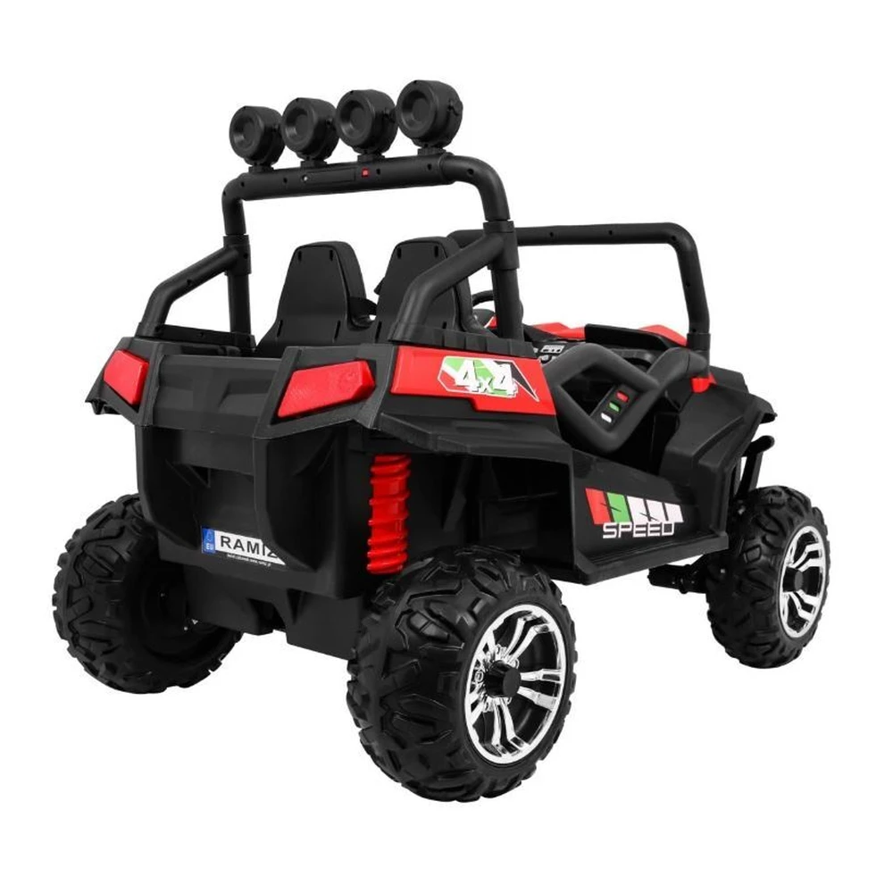 The Grand Buggy 4×4 LIFT STRONG offers a thrilling ride with 4x45W motors, 24V/5AH battery, and EVA wheels. Featuring MP3, FM radio, Bluetooth, LED lights, and remote control, this red buggy includes 2 speeds, front/back gears, and a spacious black leather seat with safety belt.