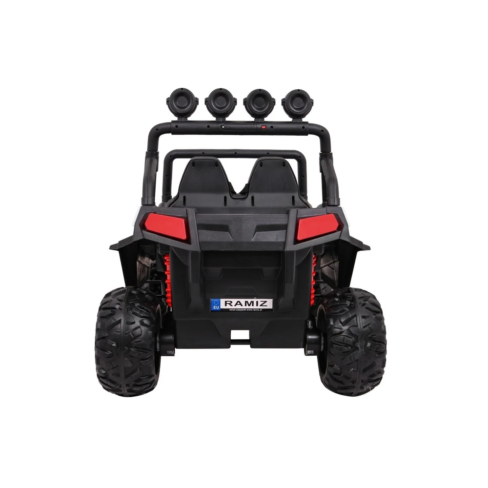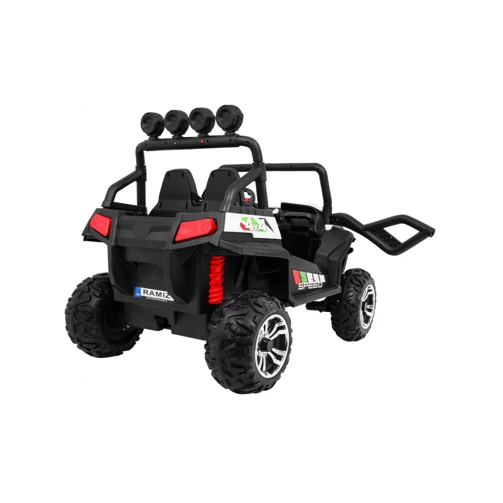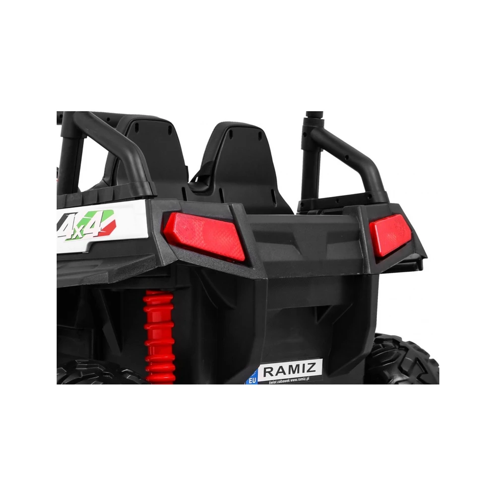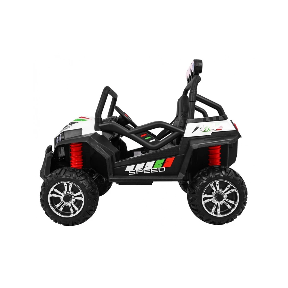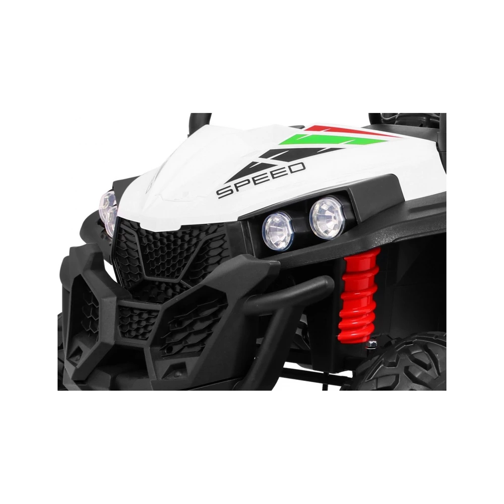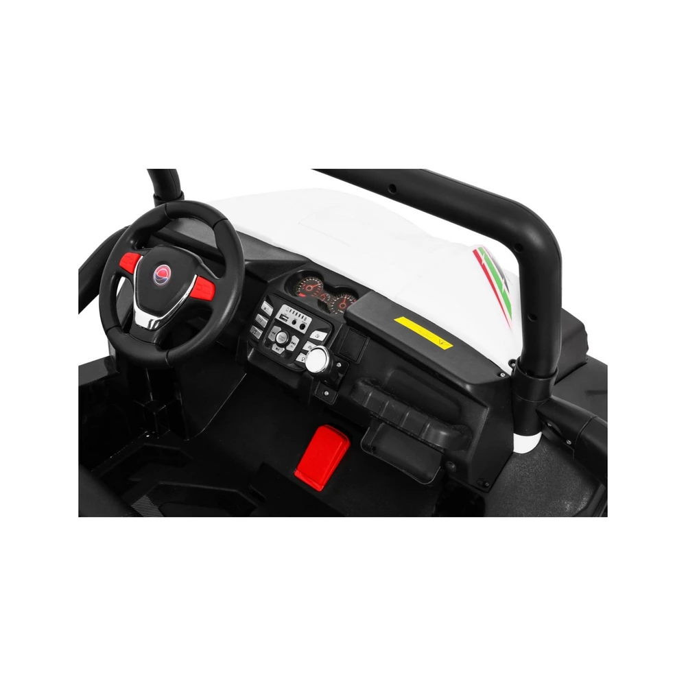 The Grand Buggy 4×4 LIFT White STRONG is a powerful 24V ride-on vehicle equipped with four 45W motors, large EVA wheels, and rear suspension for exceptional off-road performance. Its 2.4 GHz parental remote with 3 speeds and emergency stop ensures safe control, while the slow-start system and forward/back gears provide smooth driving.