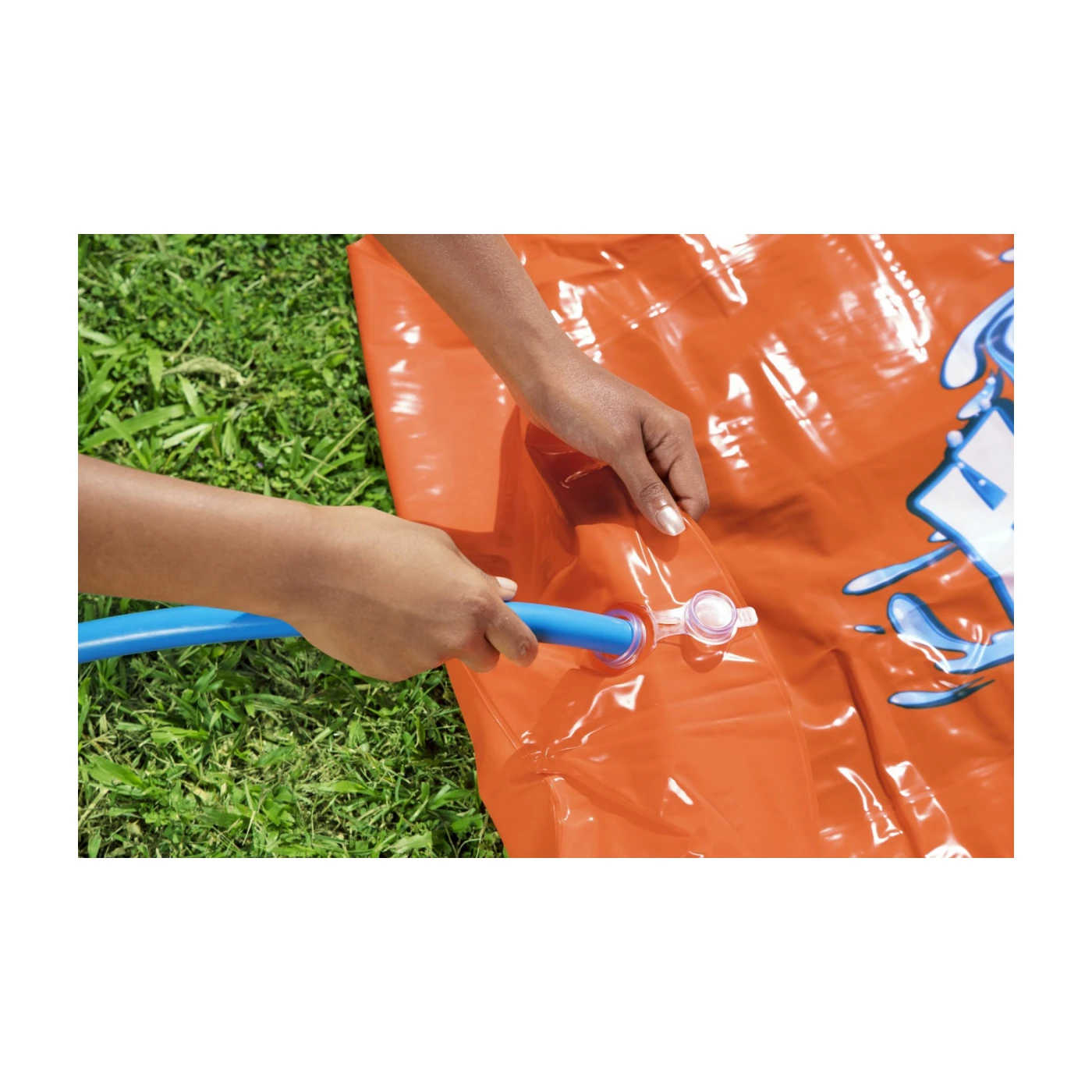| Features | * Drain valve * No utensils are needed. Plug the adapter into the garden hose and GO! * The 4.88 m long slide with two lanes is perfect for competitions and group fun * Water flows into the pool providing a large splash at the end of the descent * Built-in cushion at the start of the slide * Built-in sprinklers create a cascade effect and keep the track surface slippery |