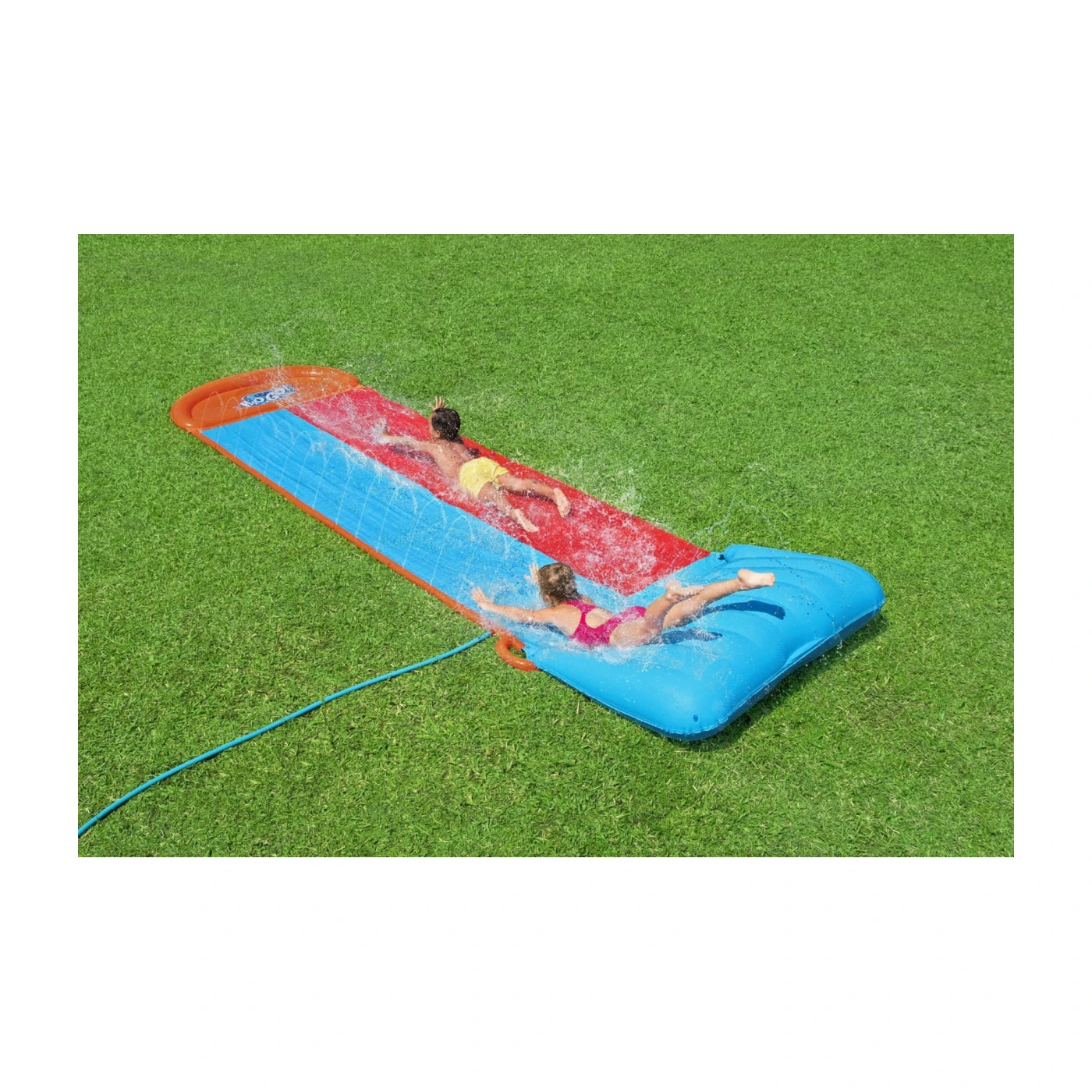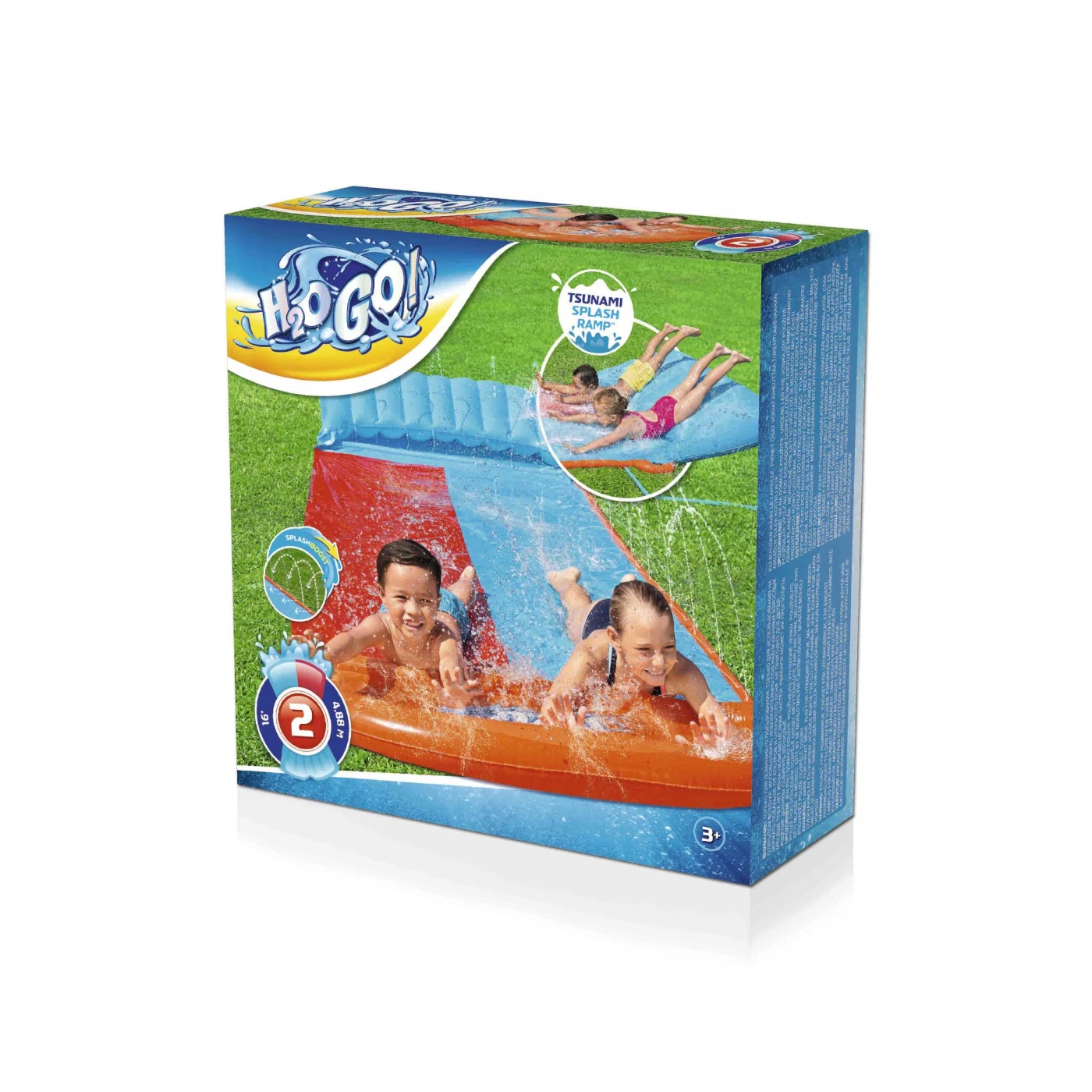 PThe H2OGO! Ultraslick Double Splash Ramp is perfect for outdoor summer fun, turning your backyard into a mini water park. With a long dual-lane design, kids can race side by side while enjoying a fast, refreshing slide that ends in a big splash.