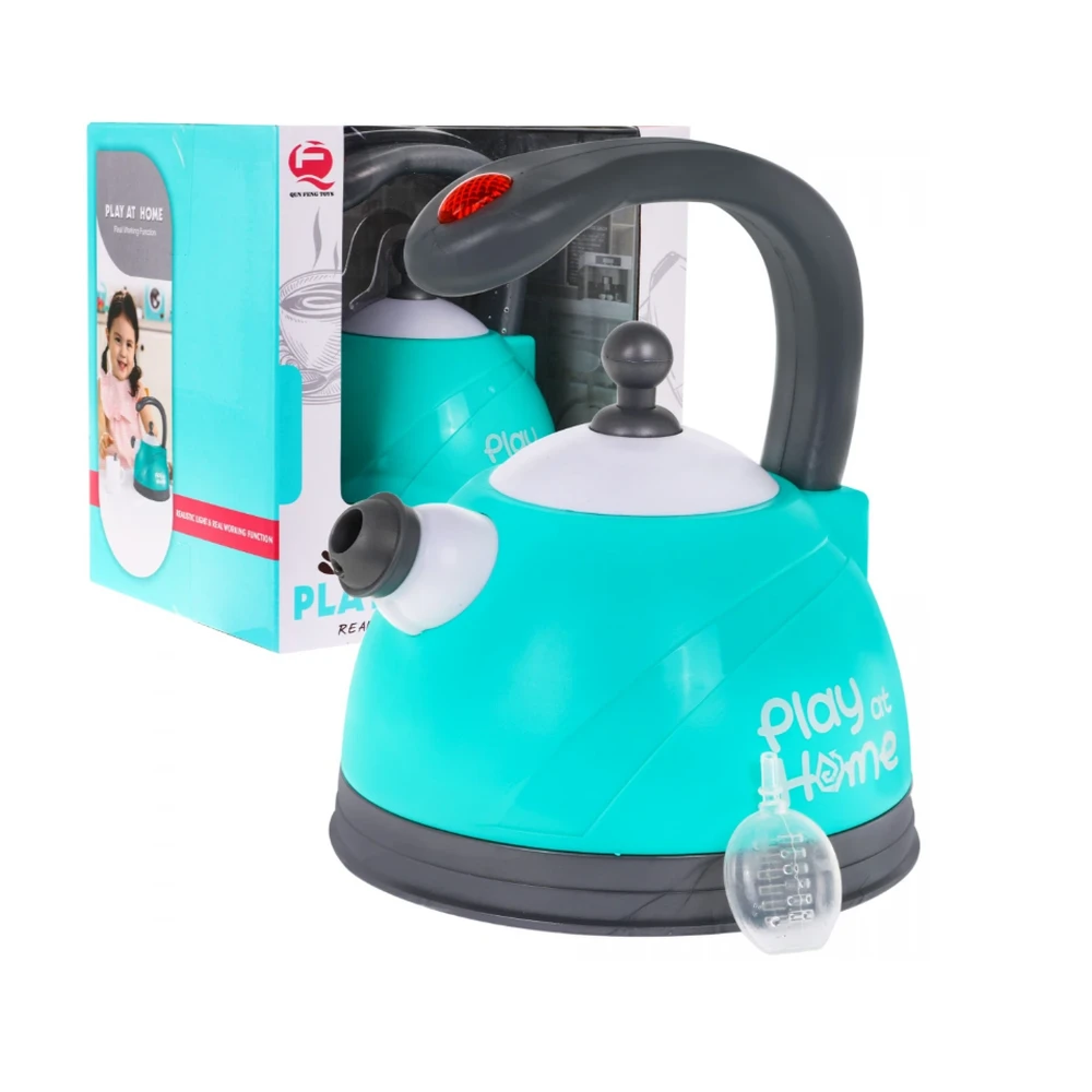 A kettle with sounds and light is a proposal for children from 3 years of age. The perfect toy for little chefs. The teapot looks and sounds like a real kettle (boiling and steaming water and the sounds of pouring water), it also lets out steam. Remove the top cover of the kettle and pour water inside. Turn on and hold the button on the handle. The water starts to boil, the kettle makes boiling sounds and the button light turns red. If the button on the handle is pressed again, the kettle starts to whistle and steam comes out of it. The steam is safe for the baby because it is cold. After tilting the teapot forward, you will hear the sound of pouring water. The toy is powered by 3 x AA 1.5V batteries, which are included in the set.