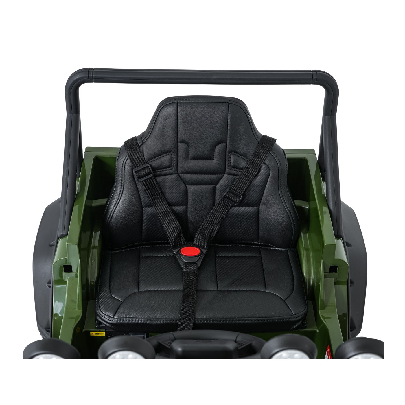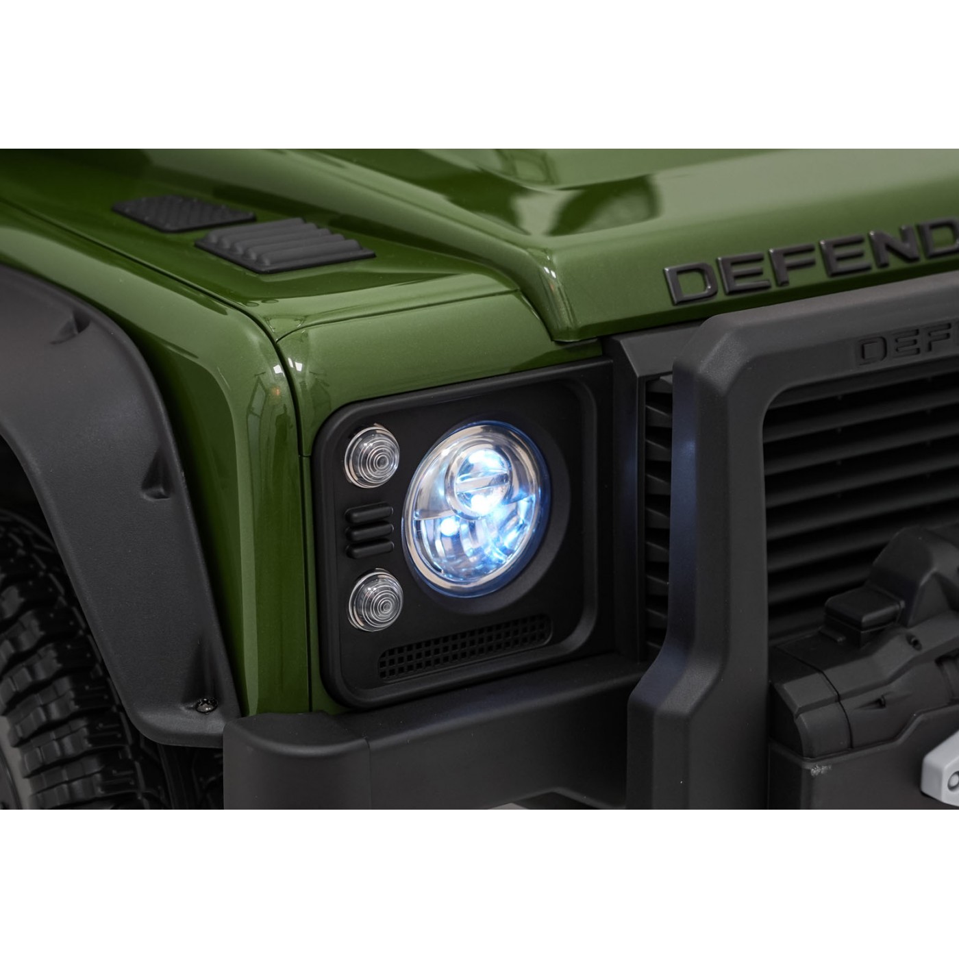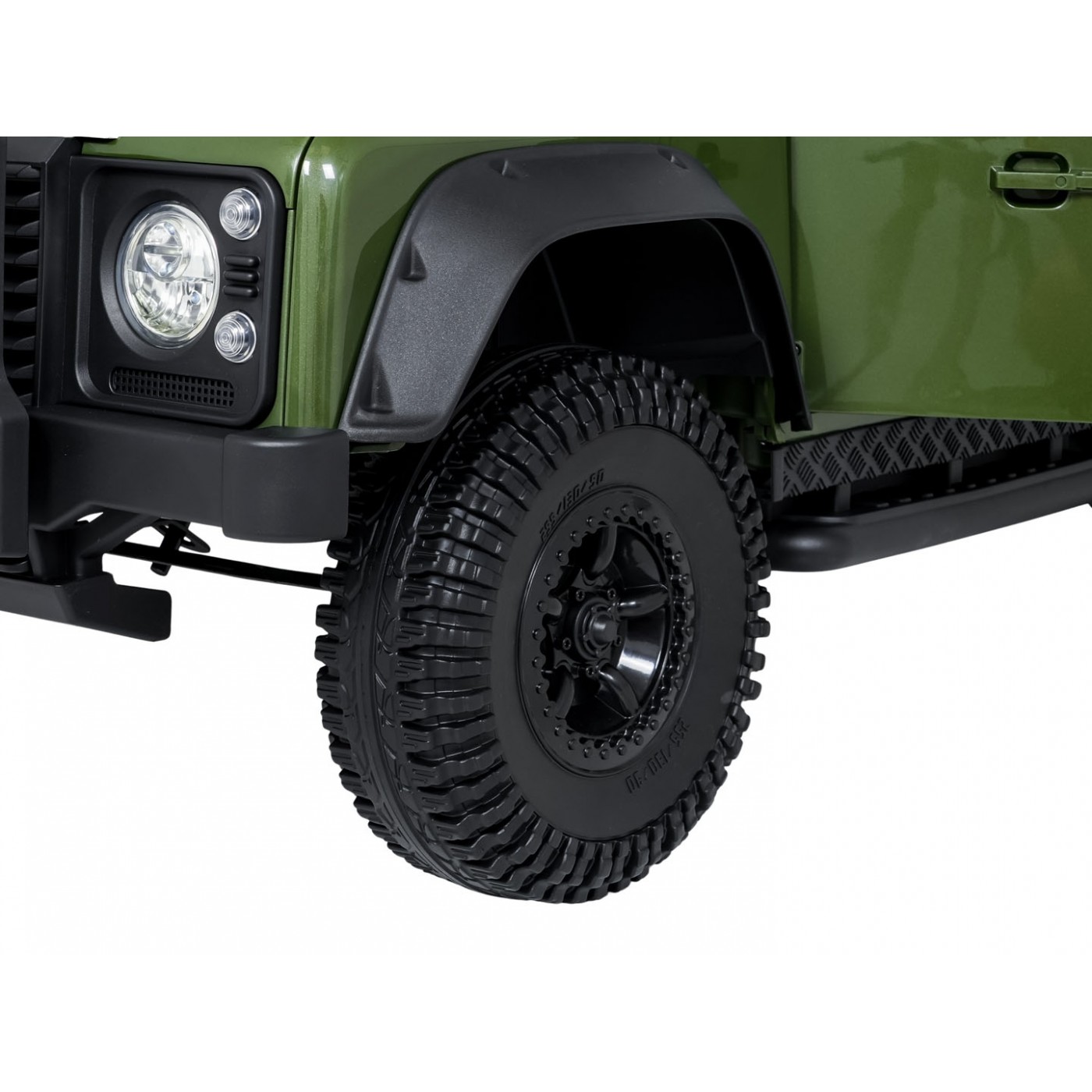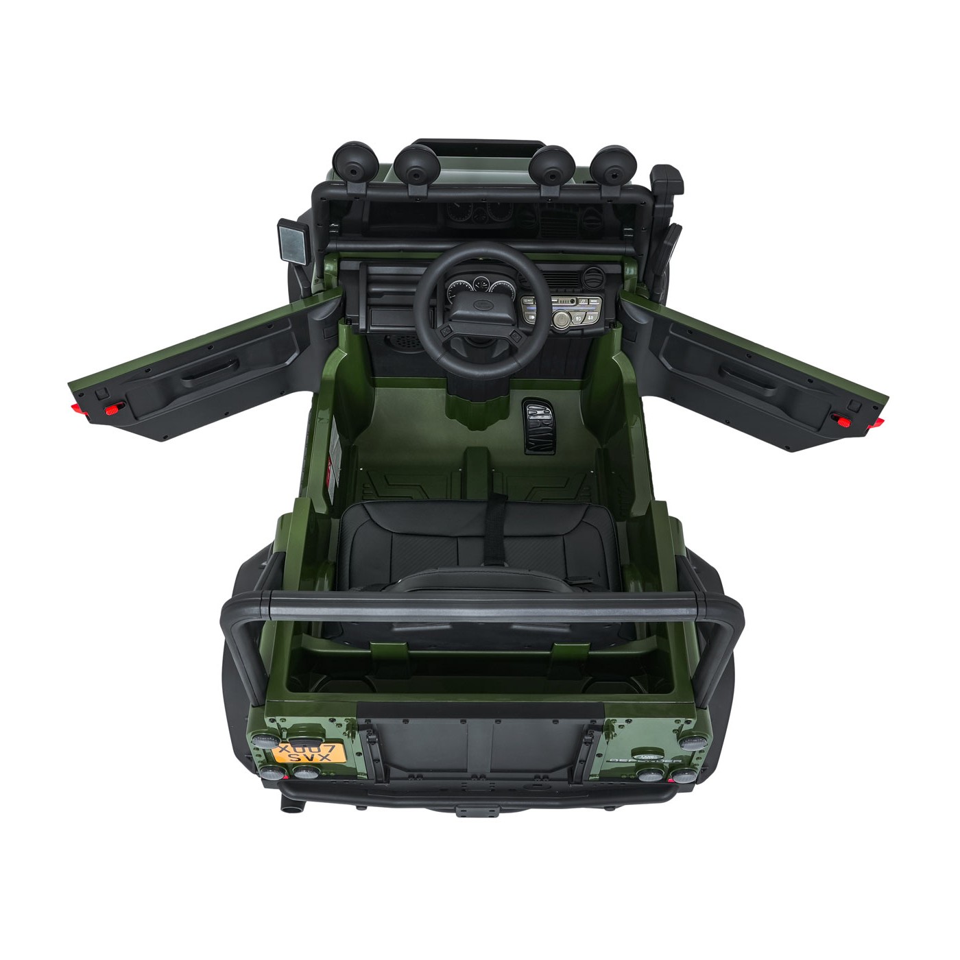 The Land Rover Defender 110 SVX Concept is a premium 24V ride-on car featuring dual 100W motors, soft start, EVA wheels with full suspension, and a 2.4GHz parental remote with Safety Stop. It includes LED lights, opening doors, an eco-leather seat with a 3-point belt, Bluetooth/MP3/USB audio panel, and a rear trunk. Built for comfort, realism, and maximum safety.