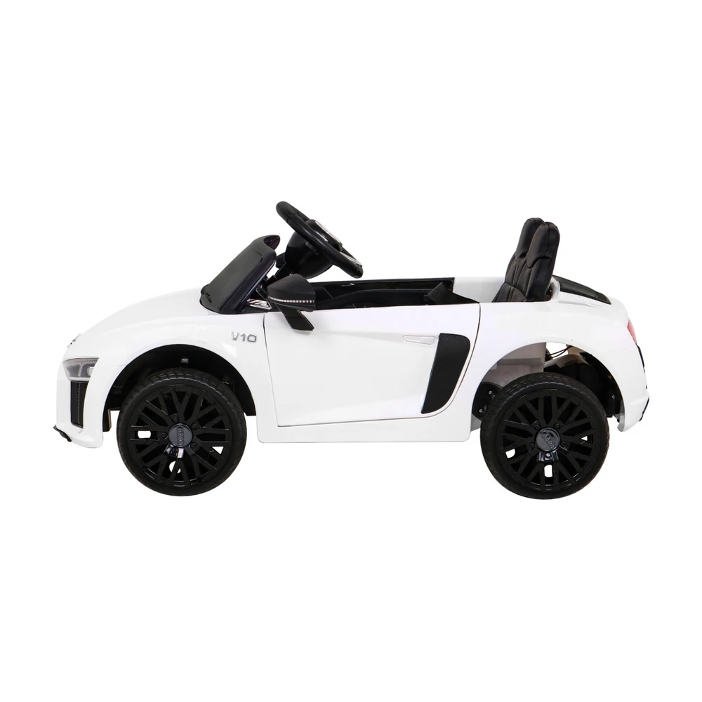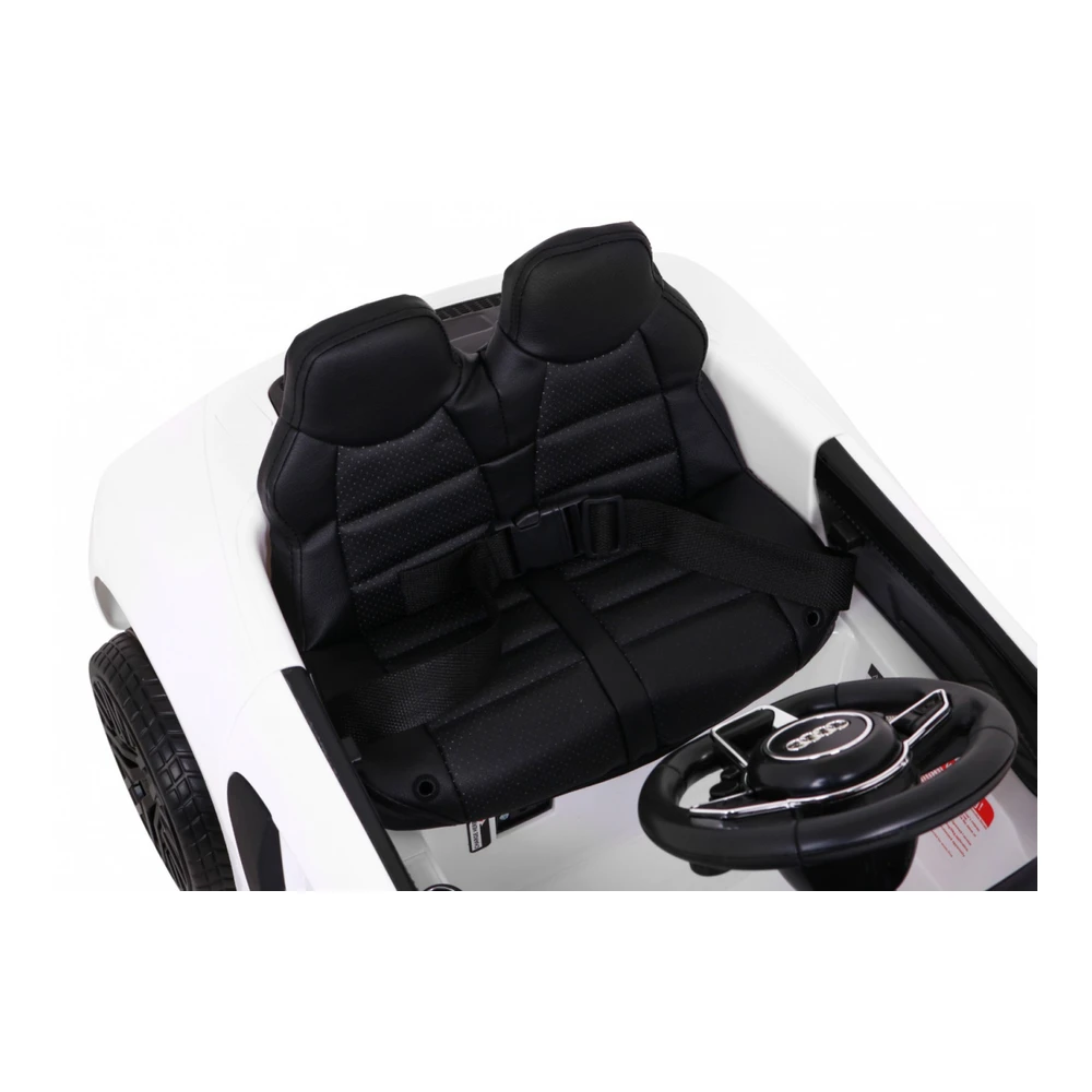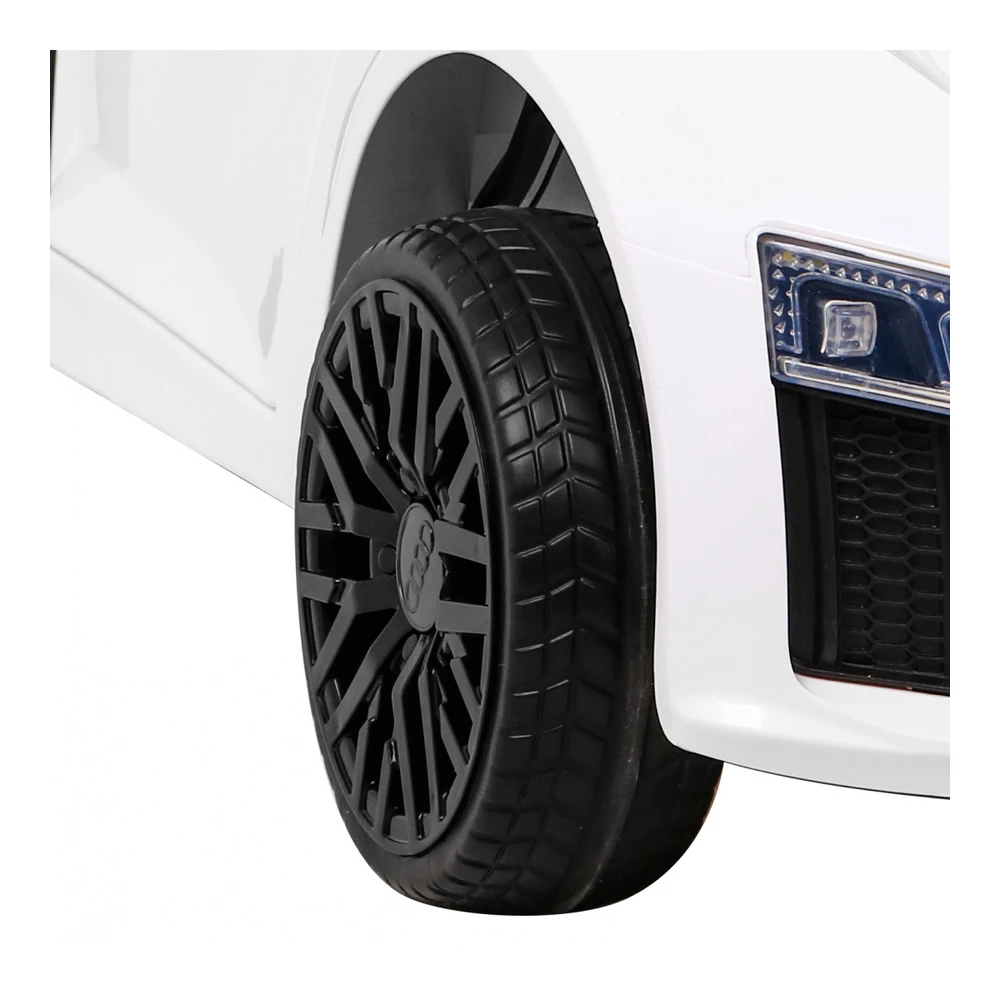 The officially licensed Audi R8 ride-on car combines luxury design and powerful performance for young drivers. Equipped with two 35W motors and dual 6V 4.5Ah batteries, it delivers smooth and safe rides with slow start and three speed modes. Features include a leather seat with safety belt, EVA foam wheels, LED headlights and taillights, and realistic start key ignition. The car also includes an educational mode, music panel with MP3, USB, SD, and AUX inputs, plus a 2.4GHz remote control for parental supervision. Perfect for children aged 3–7 years, supporting up to 30 kg.
