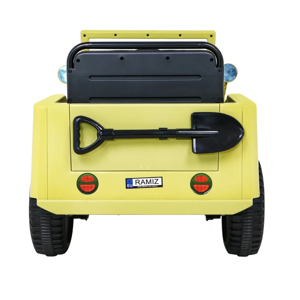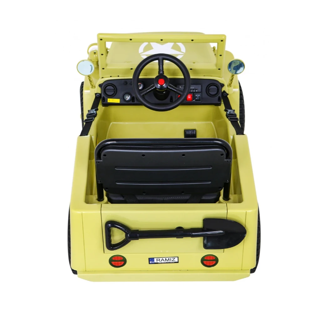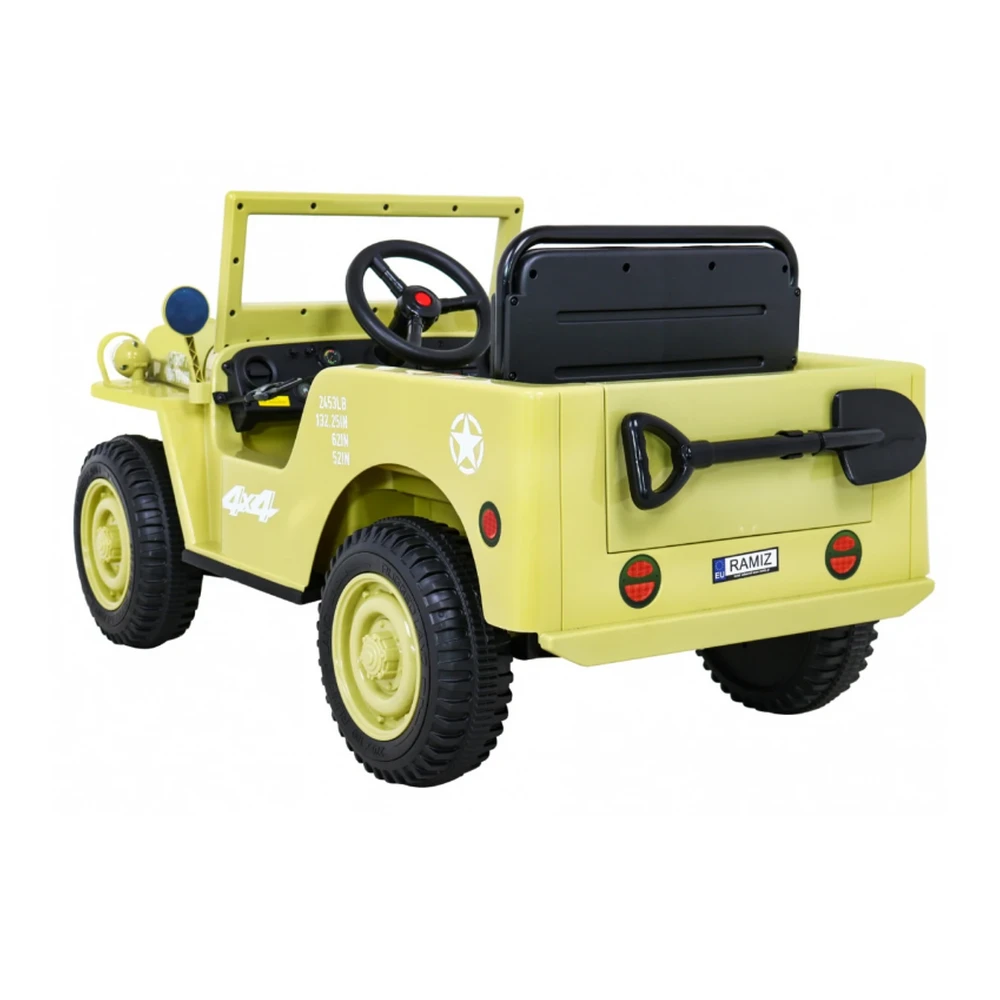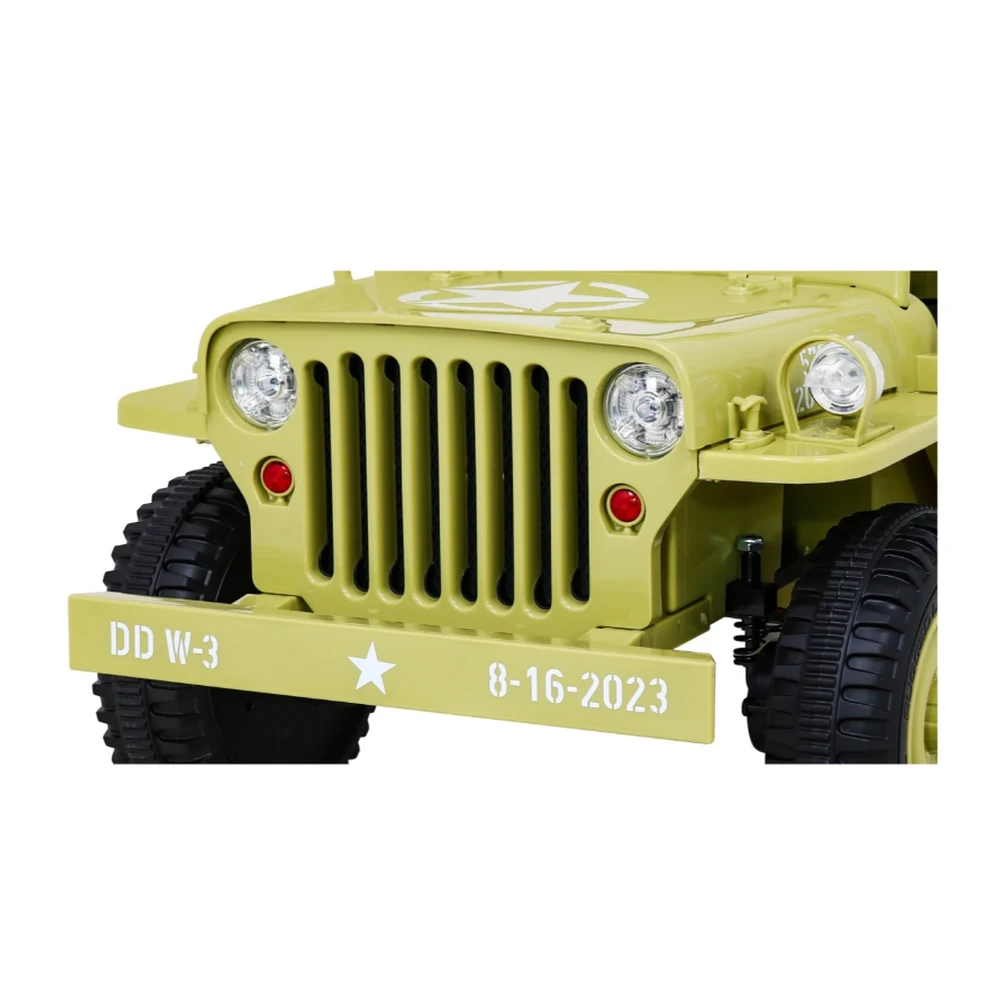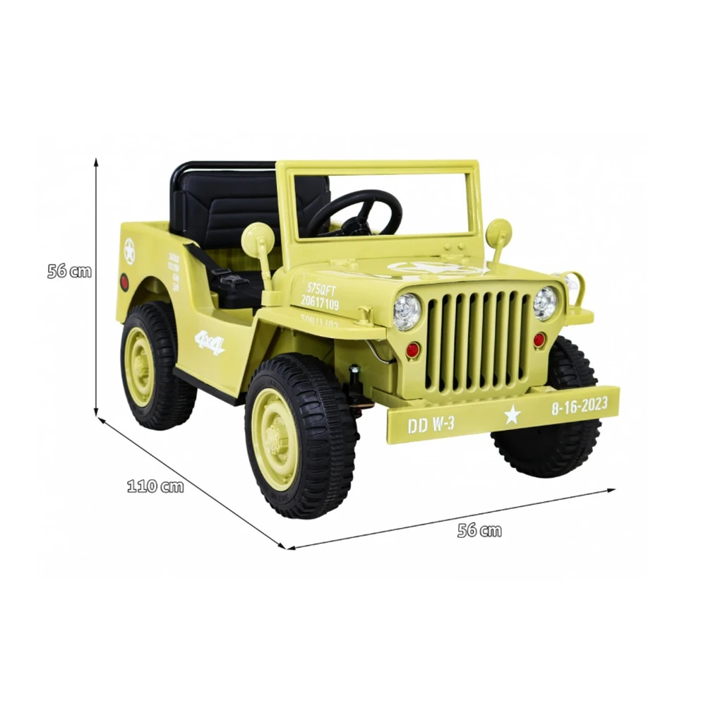 Compact 12V ride-on military-style vehicle with 4×35W motors, EVA wheels, front/rear suspension, LED lights, Bluetooth audio, and parental remote control. Features a leather seat, opening doors, and storage compartments. Ideal for children up to 3–6years.