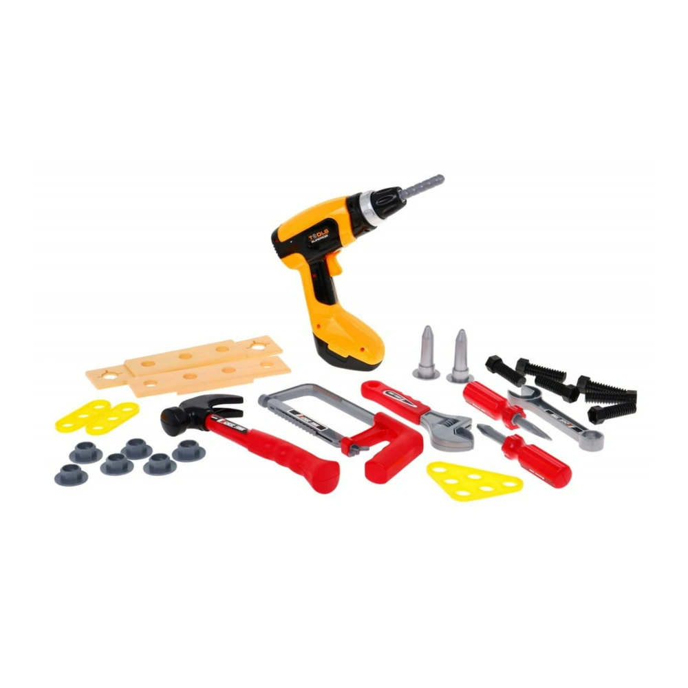 The presented set of tools is ideal for small DIY enthusiasts playing mechanics. The set includes 26 elements, everything that is necessary for a small DIY enthusiast: pins, screws, screwdriver, wrenches, hammer, hacksaw and, above all, a drill / driver powered by 2 x AA batteries (not included). The tool makes a characteristic noise when screwing in or out.