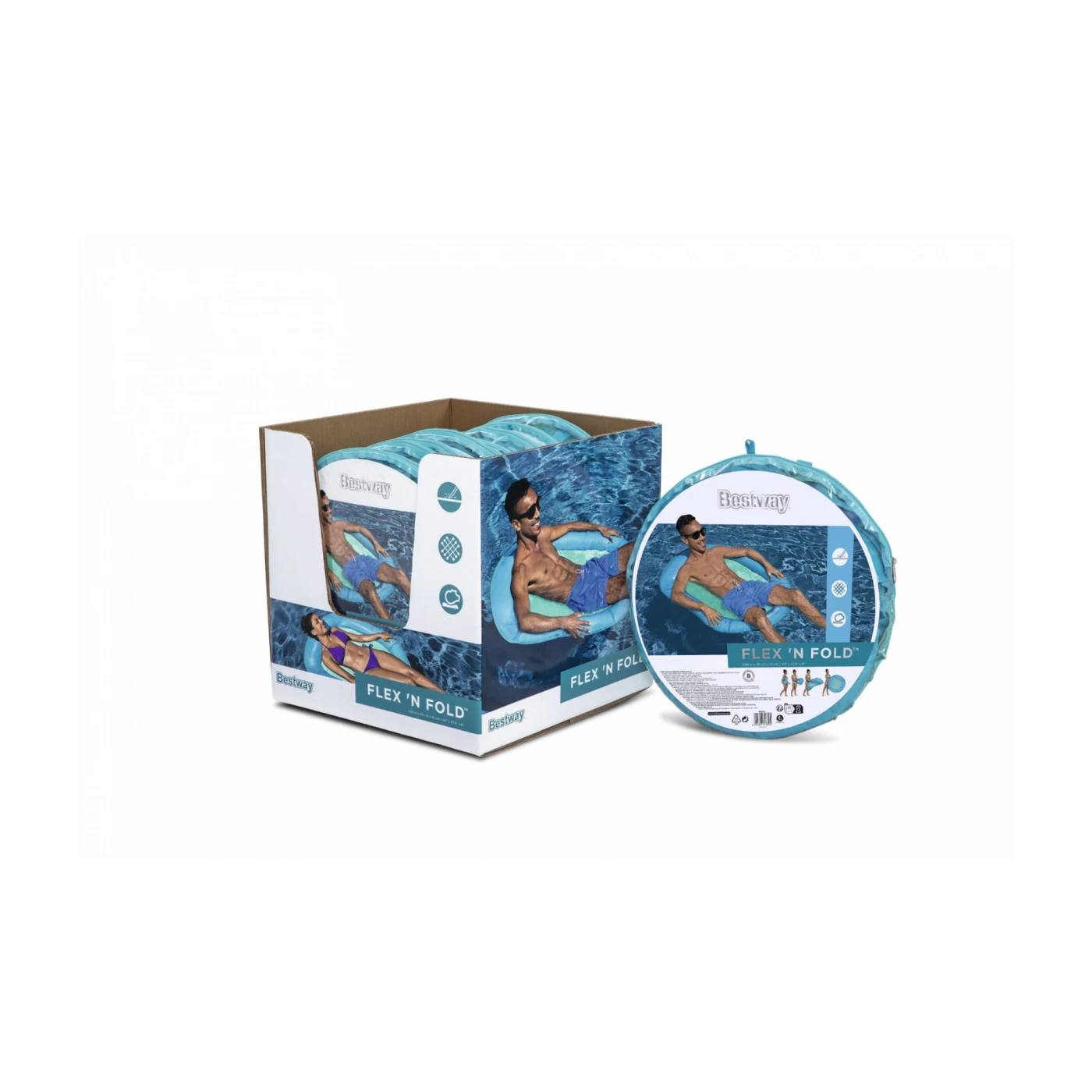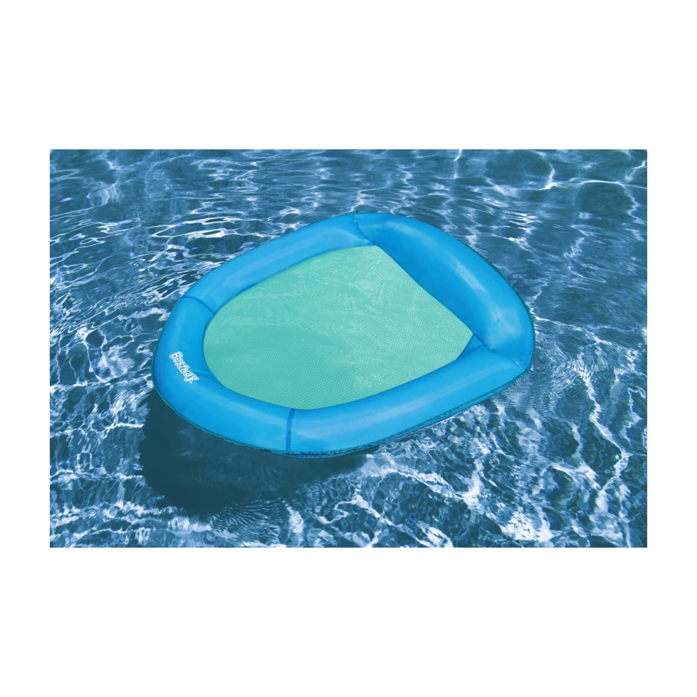 Bestway inflatable mattress-style float designed for relaxing in the pool or at the beach. It features a comfortable design with a water-permeable mesh bottom, durable material (0.22 mm), and easy-to-use valves for quick inflation. Measuring approximately 106 x 95 x 16 cm, it supports up to 90 kg, is suitable for one person, and is lightweight (about 1 kg) for easy transport.