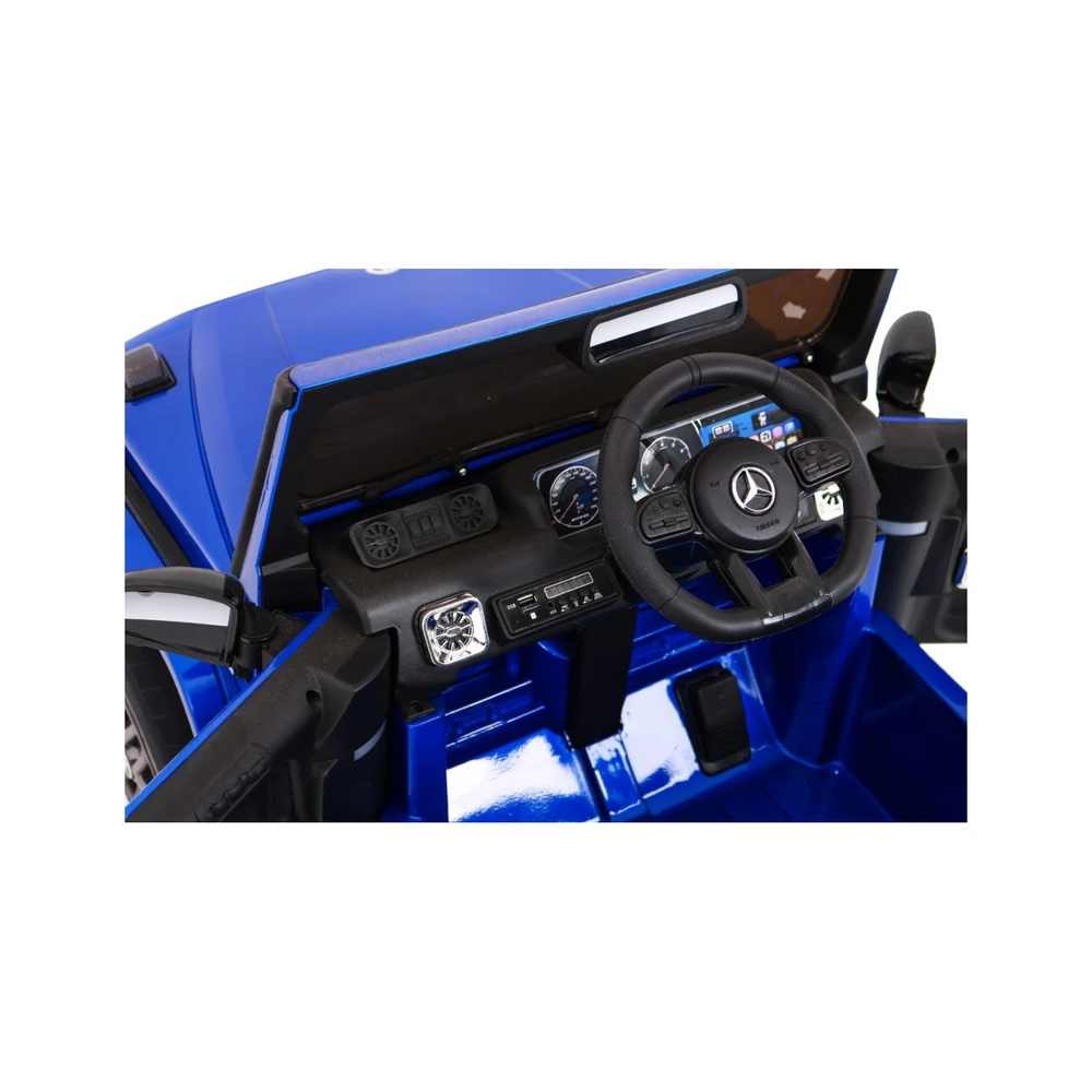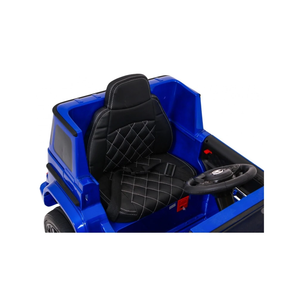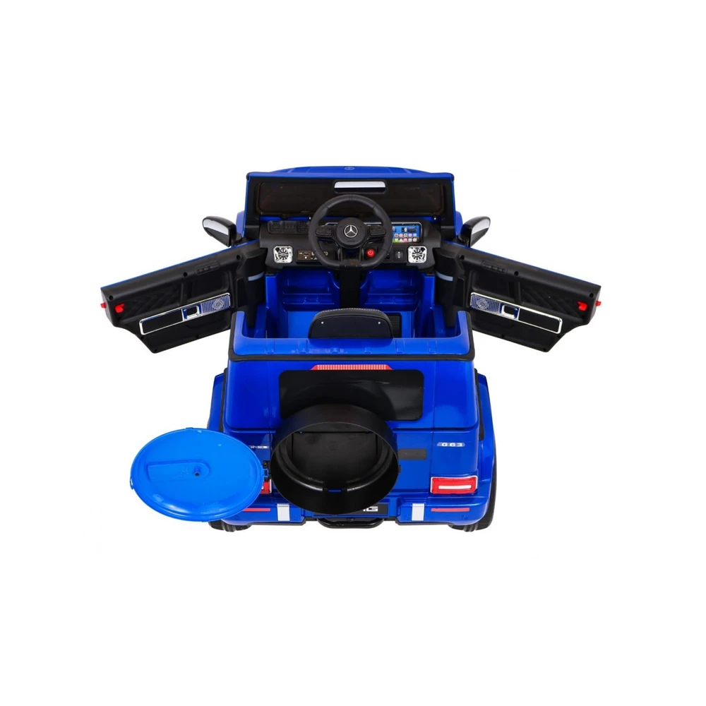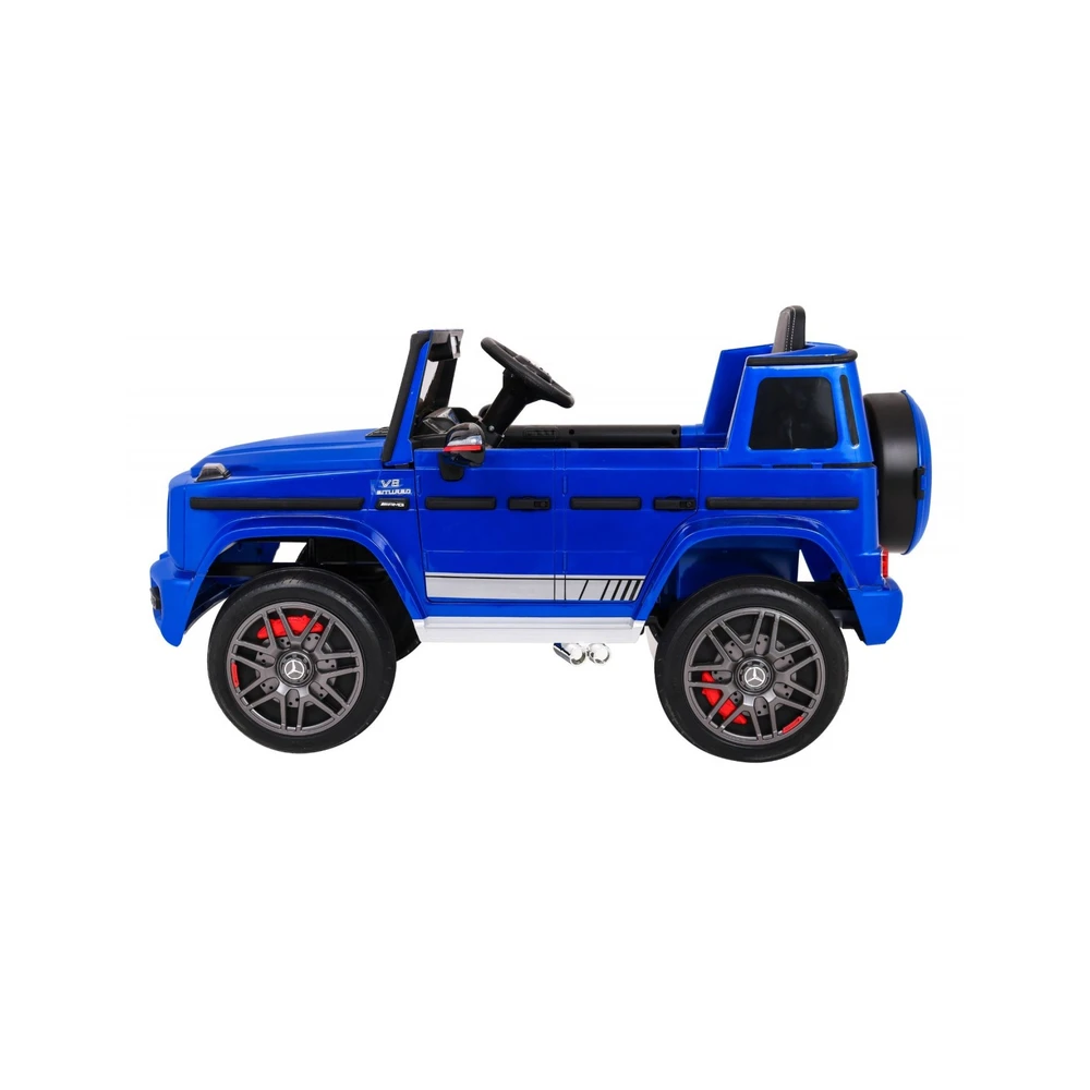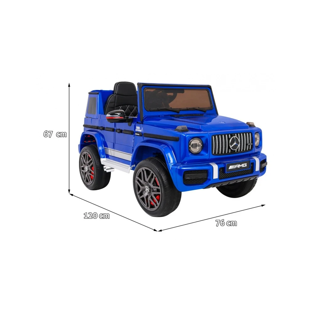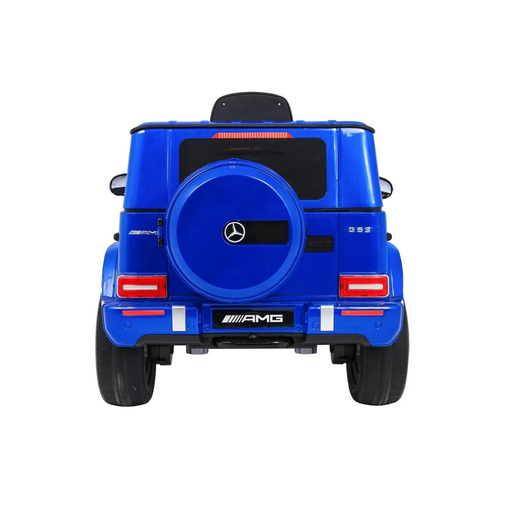 Mercedes G63 kids ride-on car with dual 35W motors, 12V battery, 2.4GHz remote, EVA wheels, LED lights, leather seat, and forward/reverse drive. Supports up to 30 kg.