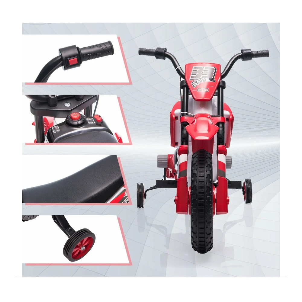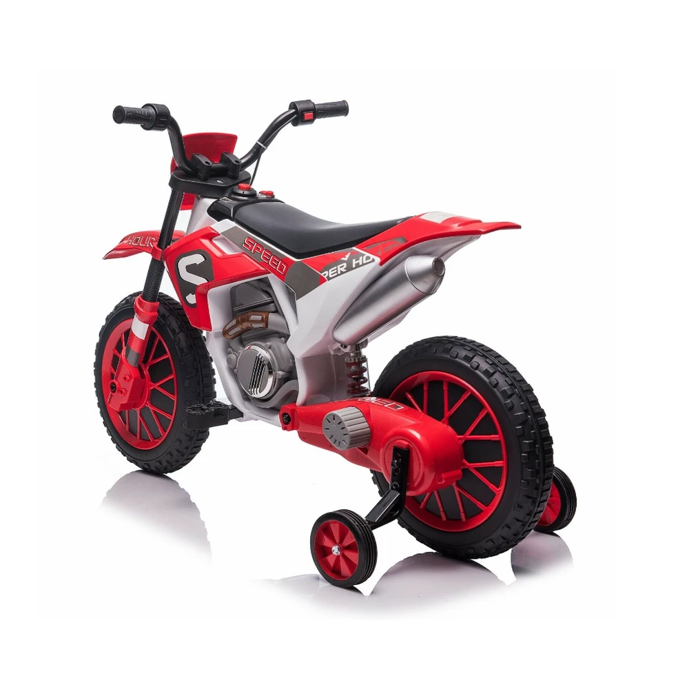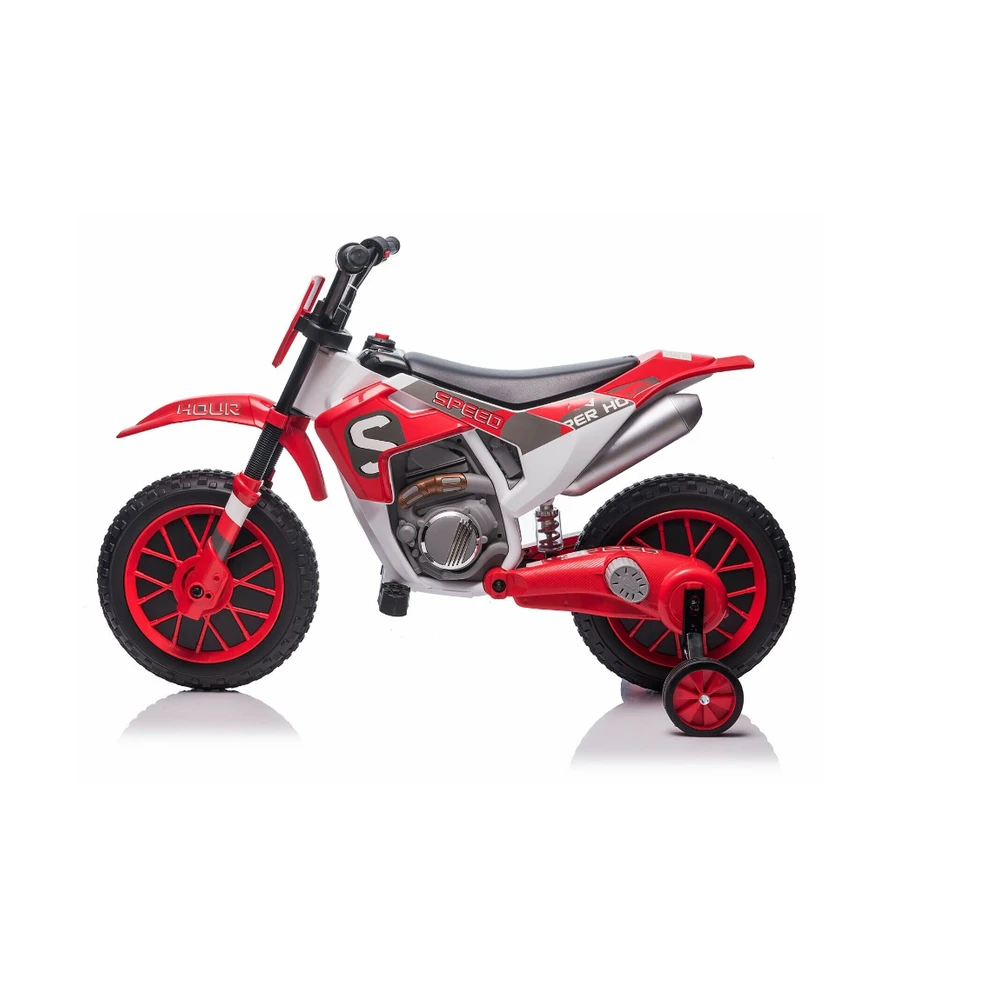 Lightweight and safe red motocross bike with inflatable tyres, designed for toddlers aged 3 months to 4 years. Made of durable PVC, easy to assemble, and perfect for early riding fun.