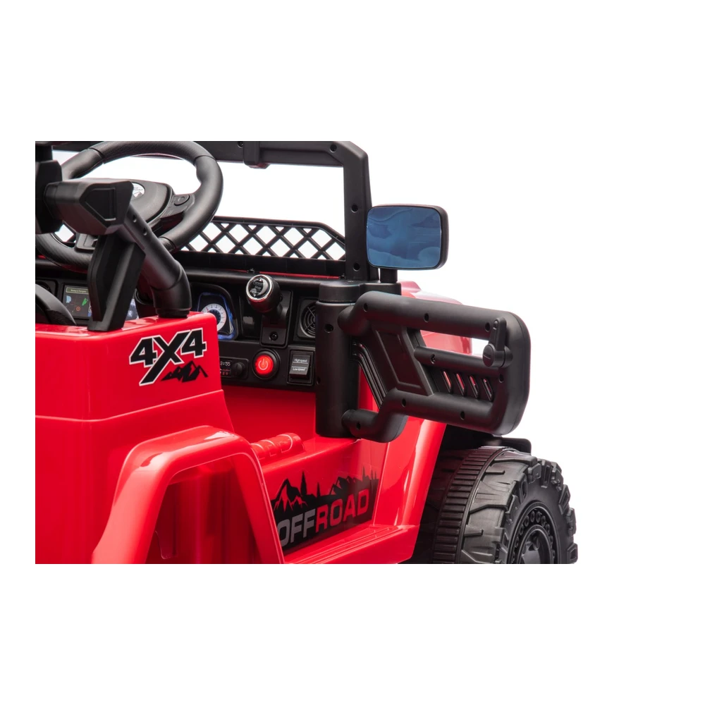 The Off-Road Climber 12V Ride-On Car is built for young adventurers who love action and outdoor fun. Equipped with four powerful motors (2×35W + 2×20W) and a 12V7Ah battery, it delivers strong performance on rough terrain. The car features EVA foam wheels, rear suspension, LED lights on the front, rear, and roof, and a premium eco-leather seat with three-point seatbelt for comfort and safety. The entertainment system includes USB, MP3, AUX, and Bluetooth connectivity, plus steering wheel buttons for melodies and horn. With slow start, two-speed drive, remote control, and manual included, this off-road vehicle ensures excitement and security on every ride.