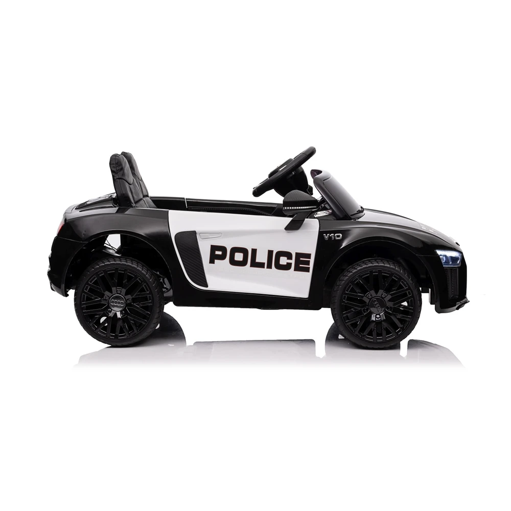 Licensed-style Audi R8 Police car with twin 35W motors and dual 6V batteries. Features EVA wheels, eco-leather seat, front and rear suspension, and MP3/AUX/USB audio system for immersive play with police lights and sounds.
